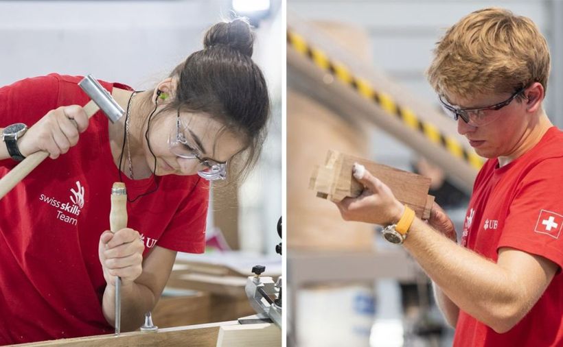 Die Möbelschreinerin Samanta Kämpf und Massivholzschreiner Jérémie Droz vertreten die Schweiz an den World Skills in Kazan. Nach dem dritten Wettkampftag läuft es den beiden gut. Sie arbeiten konzentriert und präzise. Von aussen sind keine groben Fehler sichtbar.