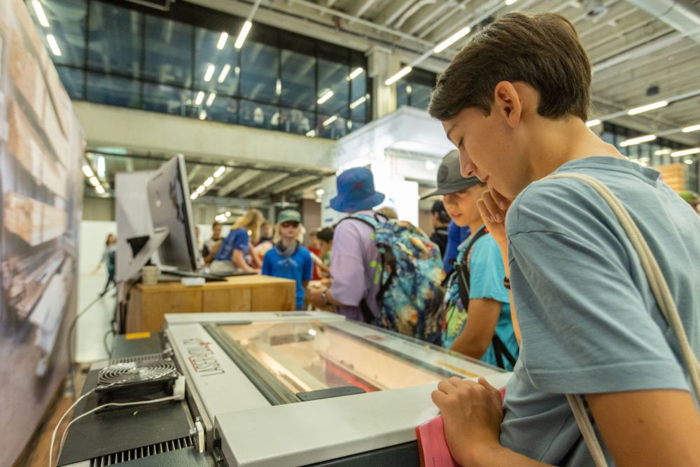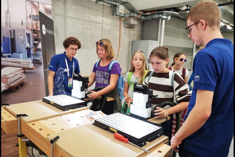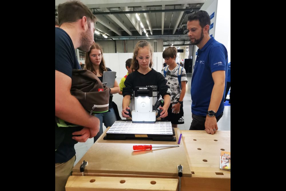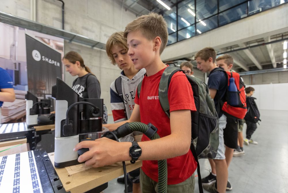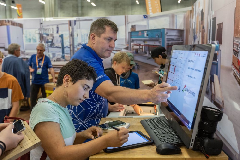 Mit der mobilen CNC Shaper Origin können sie unter Aufsicht die Löcher selbst fräsen. Das finden die Leute toll und nehmen eine gewisse Zeit in Kauf, um anzustehen. Teilweise bis zu 25 Minuten. Bei der Betreuung des Standes kommen nebst Mitarbeitenden der VSSM-Berufsbildung und der Fachgruppen auch Lernende sowie junge Schreinerinnen und Schreiner zum Einsatz.