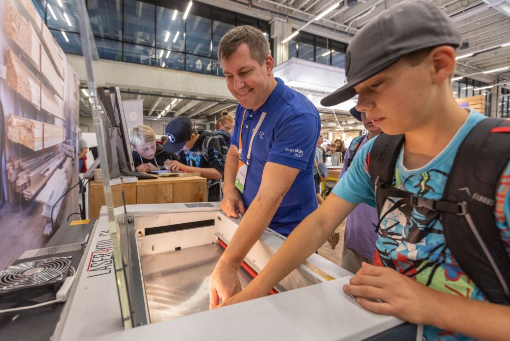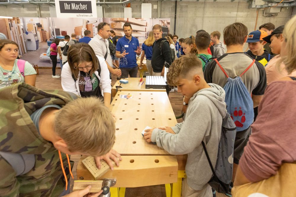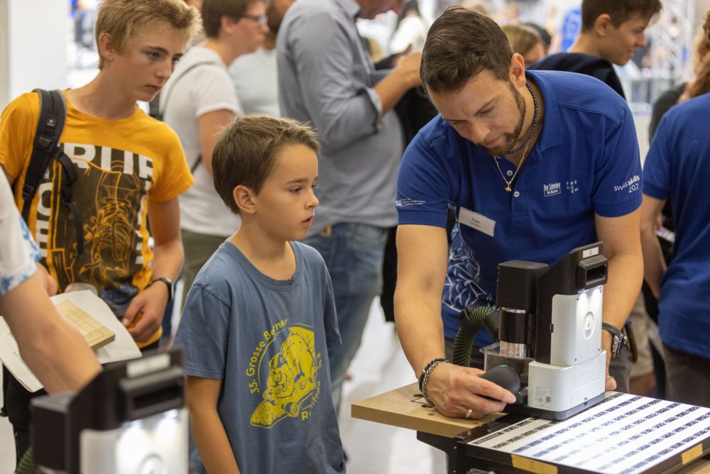Nachwuchsgewinnung. Der Verband Schweizerischer Schreinermeister und Möbelfabrikanten hat die Besucherinnen und Besucher an den Swiss Skills in Bern mit einem tollen Auftritt für den Schreinerberuf begeistert. Wer wollte, durfte unter Aufsicht selbst Hand anlegen.