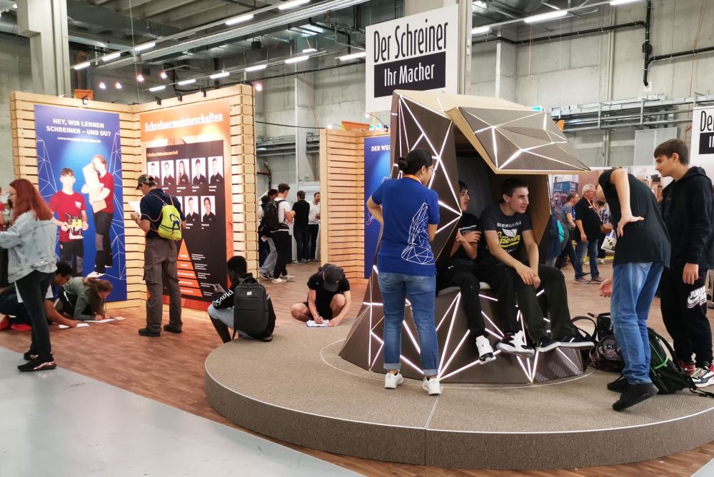Der Stand des Verbands Schweizerischer Schreinermeister und Möbelfabrikanten (VSSM) an den Swiss Skills kommt an. Der Pod Chair steht zuvorderst und macht seinen Job – er zieht viele Neugierige an, die alle in den futuristischen Stuhl sitzen und das Video anschauen möchten. Neben vielen Informationen über die Ausbildung zur Schreinerin/Schreiner EFZ sowie Schreinerpraktiker/in EBA und die verschiedenen Fachrichtungen, können die Besucherinnen und Besucher ein Mühlespiel herstellen.