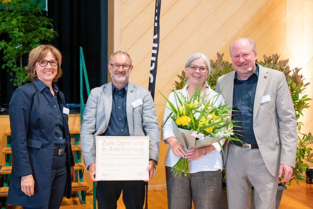 Zum Abschluss des offizielen Teils der DV, ehrten Thomas Iten und Vizepräsidentin Anita Luginbühl die abtretenden Sektionspräsidentinnen und -Präsidenten. Thomas Iten dankte Barbara Schuler-Rozzi, für ihren 10-jährigen Einsatz als Sektionspräsidentin Kanton Graubünden und lobte sie als «wirkliche Macherin in der Schreinerbranche. Ganz nach dem Motto ‹Die Schreinerin – Ihre Macherin›.» Anita Luginbühl hob die «ruhige und besonnene Art» von Roland Speck, hervor und attestierte dem nach elf Jahren Amtszeit abtretenden Präsidenten der Sektion Zug: «Er hat einen fantastischen 360-Grad-Blick und denkt an alle und an alles.» Bei Dölf Müller, der seit 5 Jahren als Co-Präsident des Schweizerischen Fachverbands Fenster- und Fassadenbranche (FFF) und an der DV in den Ferien weilte, erklärte Luginbühl, dass sein Engagement dazu beigetragen habe den Verband zu stärken und ihn auf einen erfolgreichen Weg zu führen.