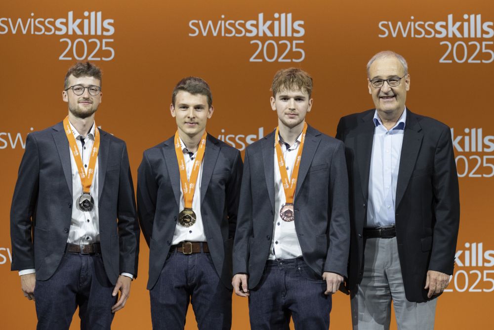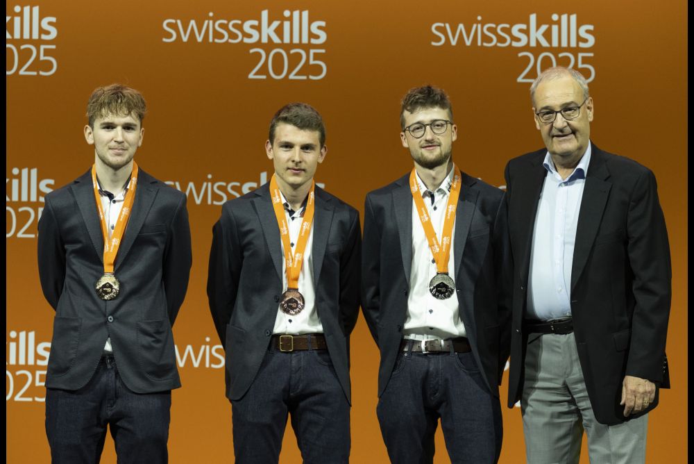 Siegerbild mit Bundesrat: Silvan Reichen (links, Gewinner Kategorie Möbelschreiner), Augustin Mettraux (Bronze), Florian Länzlinger (Silber) und Guy Parmelin. Bild: Manu Friedrich (Swiss Skills)