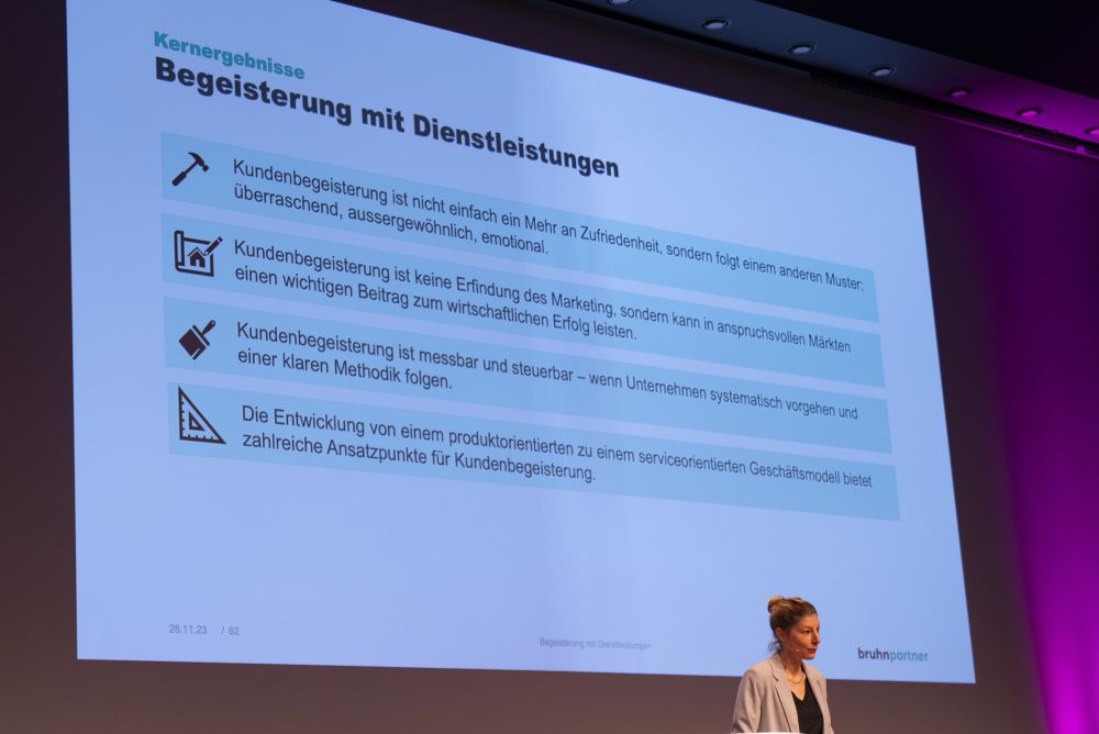 Mareike Ahlers, CEO della Prof. Bruhn & Partner AG di Basilea ed esperta di strategie di crescita sostenibile, ha aperto la sua presentazione chiedendo ai presenti quando si sono ispirati l'ultima volta. I clienti vogliono essere ispirati e si aspettano soluzioni personalizzate. Nella maggior parte dei casi, un servizio standard non è più sufficiente. L'entusiasmo può essere innescato da una grande soddisfazione o da una sorpresa. L'eccesso di soddisfazione crea soddisfazione superando le aspettative. Le sorprese soddisfano esigenze inaspettate. Non solo aumenta la soddisfazione, ma fornisce anche un piacevole shock.